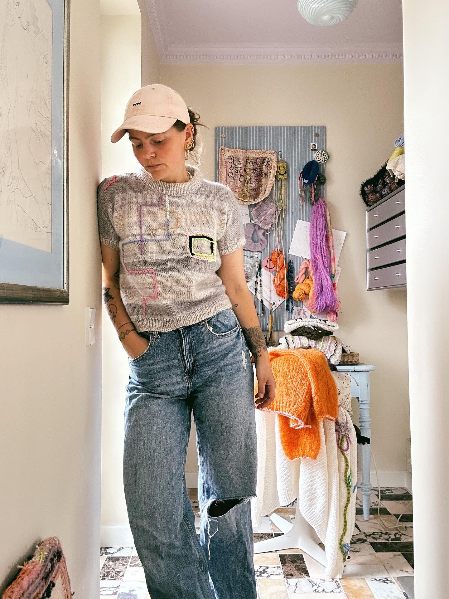 Julie er dygtig på hænderne og strikker meget. Også her bruger hun farver sammen på kryds og tværs, men altid med en mild creme i farvespektret. Det samme gør hun i boligen.