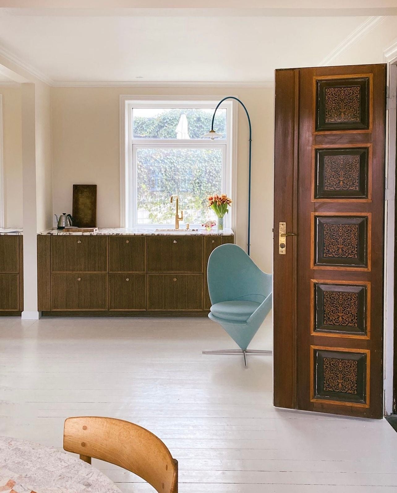 Husets gulve er malet i `Hvid Morbær`, køkkenvæggene i