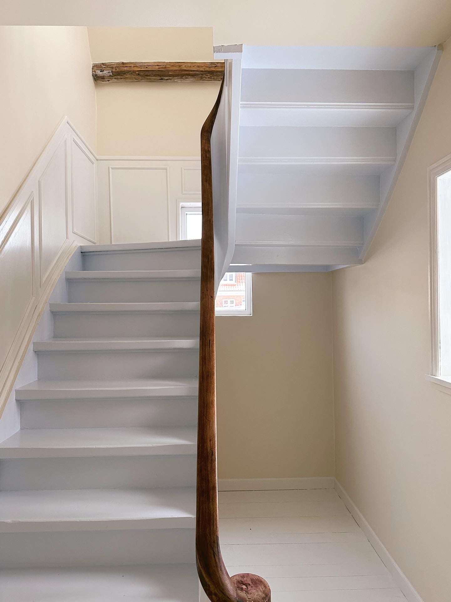 Vægge malet i `Rom`, panel og gulv malet i `Hvid Morbær`og trappe i `Himmelblå`.