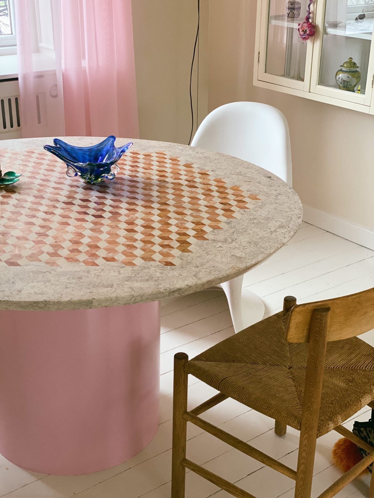 Julie elsker at finde gamle ting og upcycle, som bordet her lavet af en gammel, rund marmorplade og et rør blot malet i `Bubblegum`.