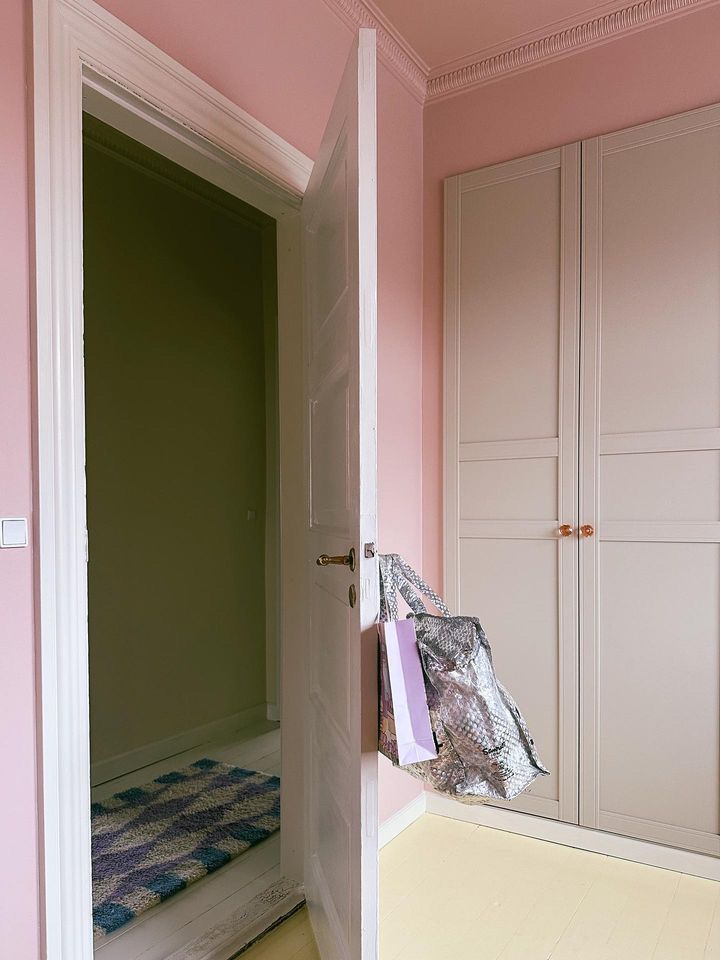 Julie gør brug af flere farver sammen og formår stadig at skabe et æstetisk look. Som her i Vanillas værelse, med vægge i `Eventyr`, skabslåger malet i ´Olivensand`og gulv i `Sommer`. En mild trilogi af lyserød, grøn og gul. I entréen et kig til det bløde Dot berbertæppe.