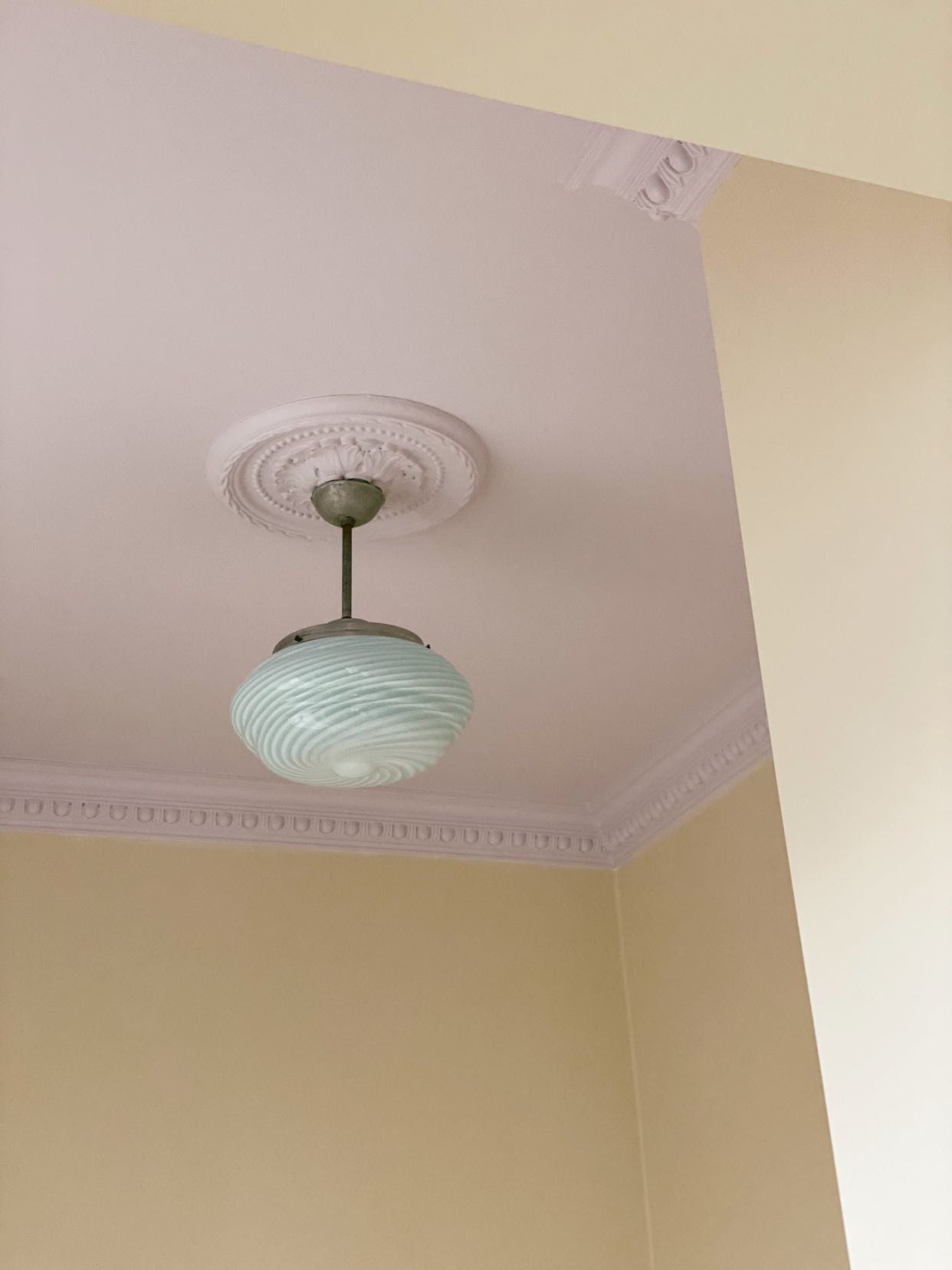Lidt loftshimmel i `Lavendel Blush, når man indtræder husets lille entré. Vægge i `Rom`.