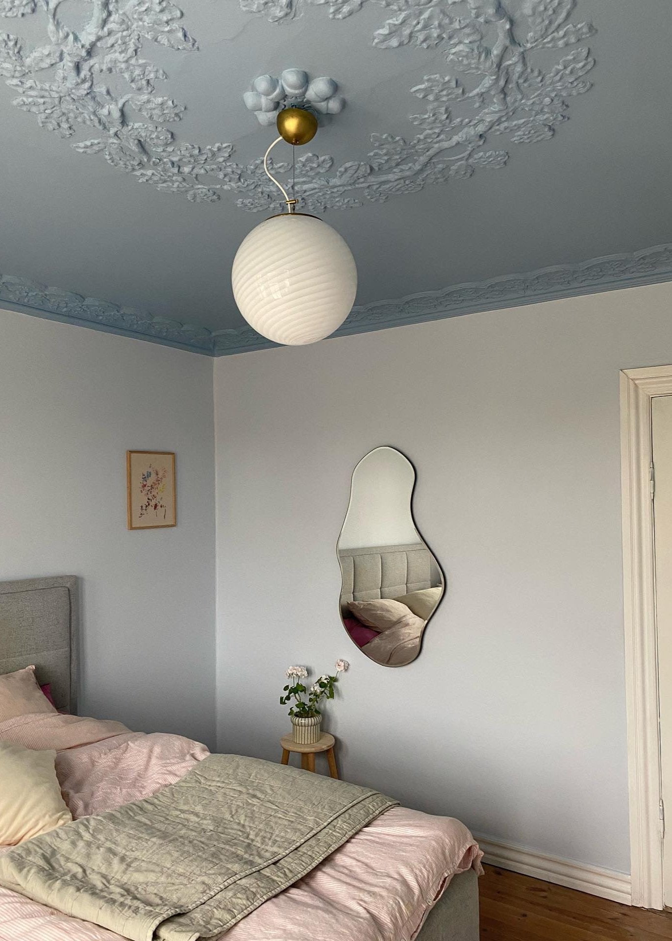 En næsten himmelsk farvekombination, der giver rummet ro og gør soveværelset til et sted, man har lyst til at trække sig tilbage til.