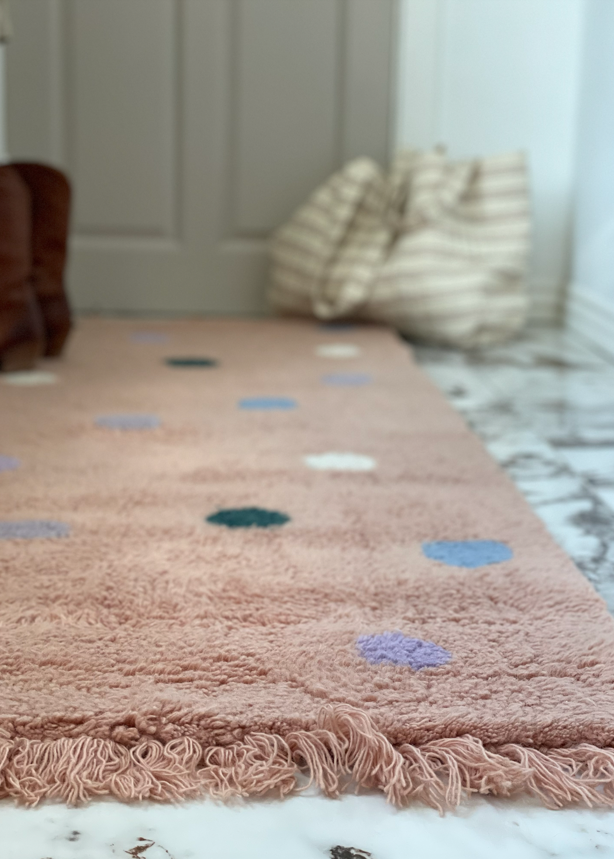 Vi elsker, hvor meget hygge og karakter vores smukke uldtæpper kan tilføre hjemmet. Brug det prikkede tæppe i entréen, køkkenet, stuen – eller som et farverigt indslag i soveværelset.