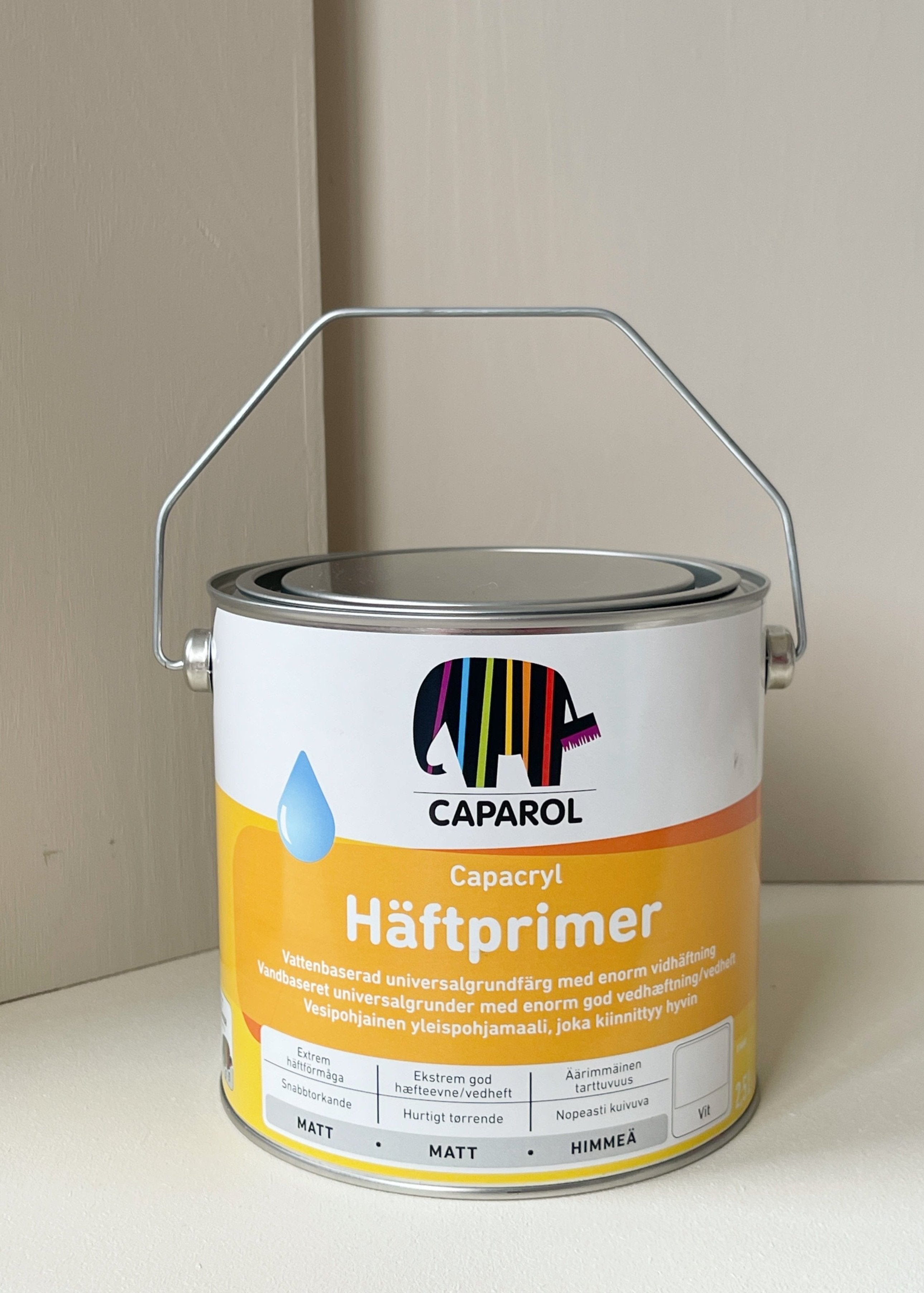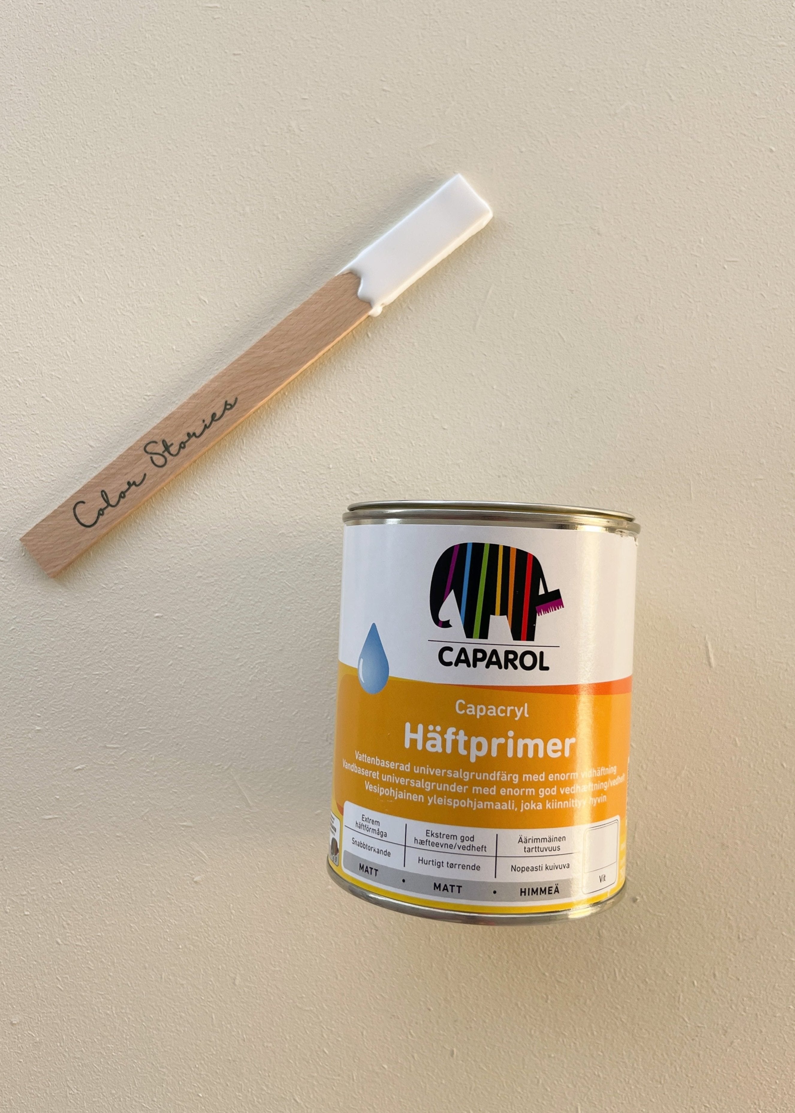 Vi anbefaler at anvende hæfteprimeren, inden du maler med Color Stories maling, for at sikre en god vedhæftning samt et ensartet resultat på glatte overflader som fx møbler af træ og laminat, plast og fliser mm.